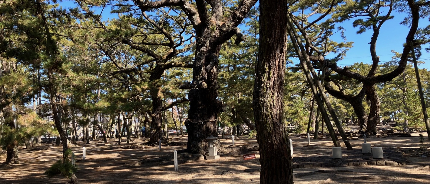 七福神の松:松原の中に注連縄(しめなわ)で巻かれた「恵比須の松」「大黒天の松」「福禄寿の松」「毘沙門天の松」「布袋の松」「寿老人の松」「弁財天の松」7本の老松が点在しています。